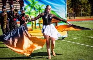 COLORGUARD is the visual ensemble that performs in conjunction with the instrumental players of the marching band. A “corps style” field show is incomplete without this versatile unit. The guard members enhance the overall performance through the use of color, equipment, and physical movement. Colorguard is a totally extra-curricular group. Students are selected through an audition process during the spring semester. The colorguard is sponsored by Mr. Tomberlin through the band program, but brings in additional instructors who specialize in guard work. These instructors are contracted through our booster association and are responsible for the choreography and instruction.