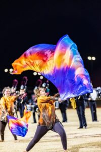 COLORGUARD is the visual ensemble that performs in conjunction with the instrumental players of the marching band. A “corps style” field show is incomplete without this versatile unit. The guard members enhance the overall performance through the use of color, equipment, and physical movement. Colorguard is a totally extra-curricular group. Students are selected through an audition process during the spring semester. The colorguard is sponsored by Mr. Tomberlin through the band program, but brings in additional instructors who specialize in guard work. These instructors are contracted through our booster association and are responsible for the choreography and instruction.
